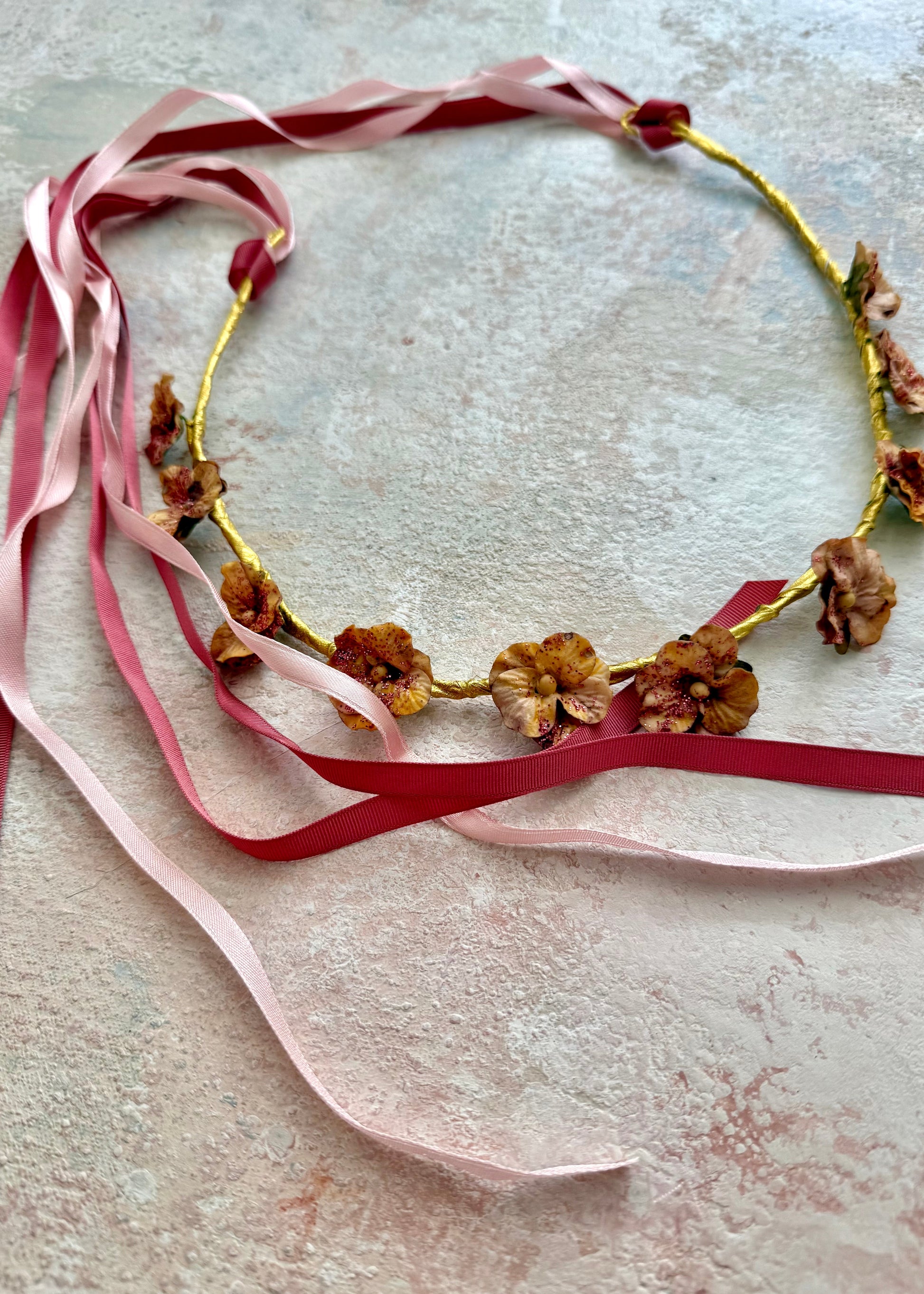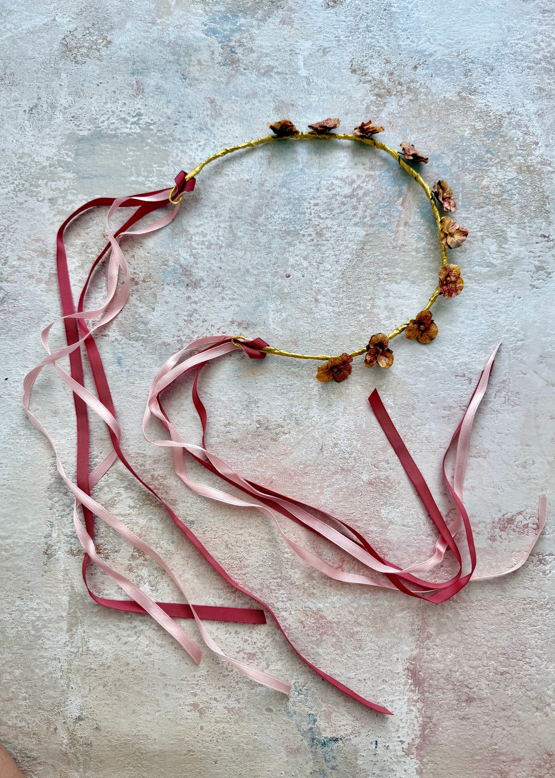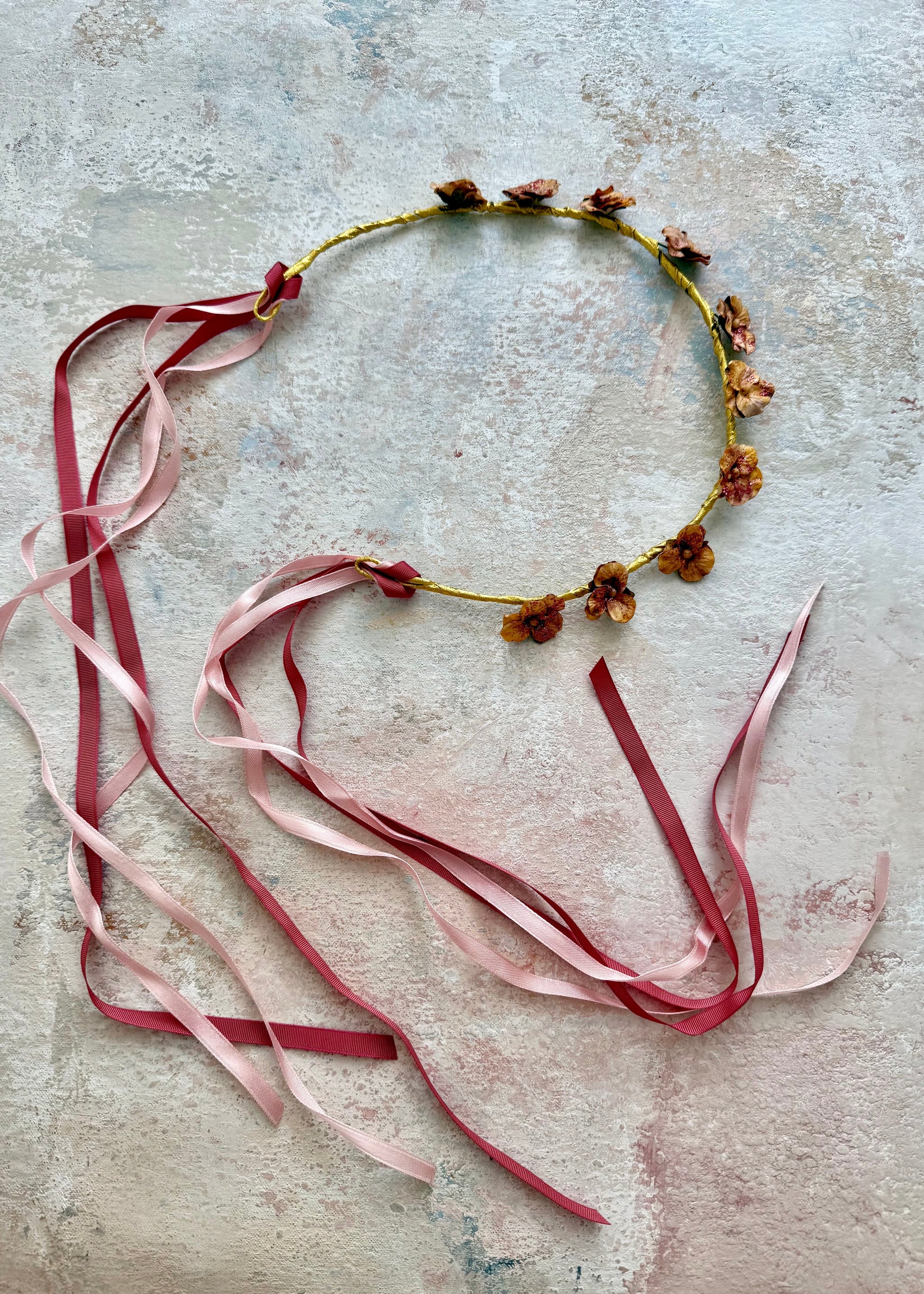 Perfect for the races or a spring bride. A modern day heirloom using antique pieces. Upcycled from found vintage millinery materials including silk ribbon and flowers onto an adjustable wire crown base. Wire can be gently bent to suit head size and flowers and buds can also be adjusted to preferred height, tied with ribbon to suit multiple sizes.